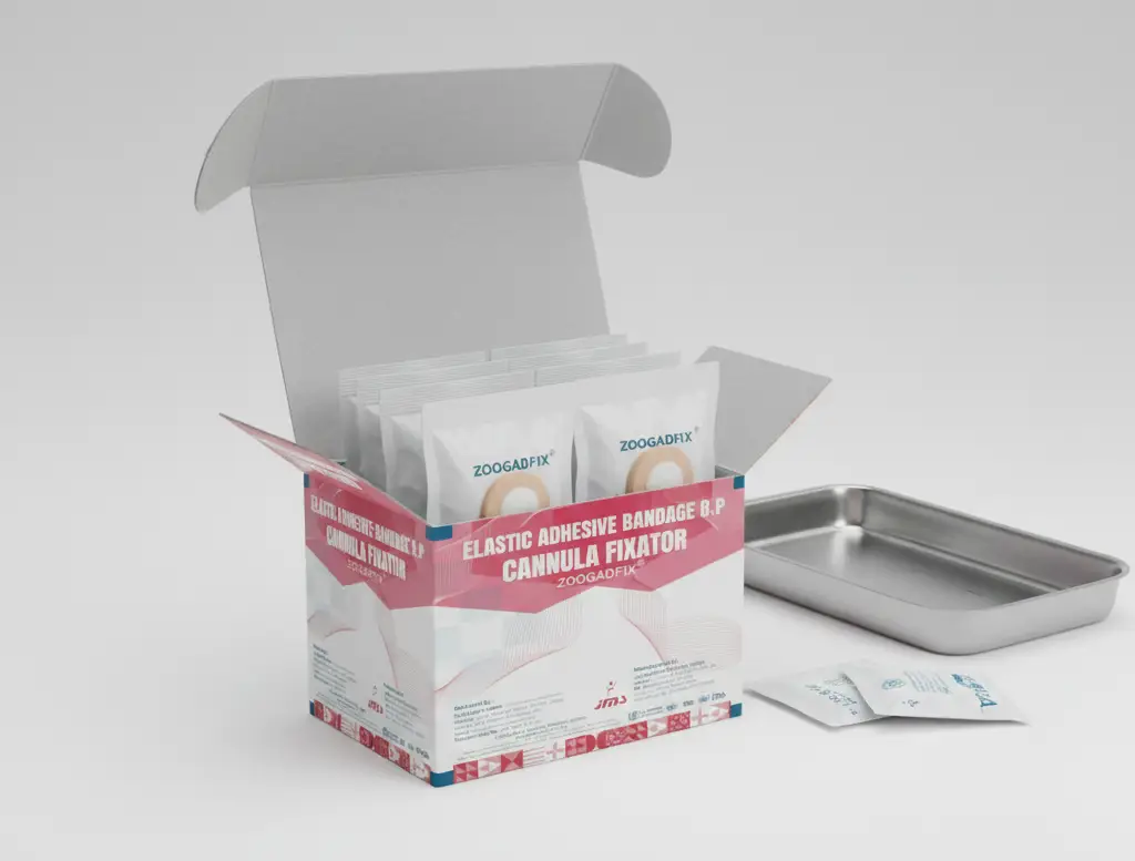 A specialized elastic adhesive dressing specifically engineered for the secure and stable fixation of IV cannulas. The Zoogadfix design combines premium flexibility with strong adhesion to ensure patient comfort and reliable device placement.